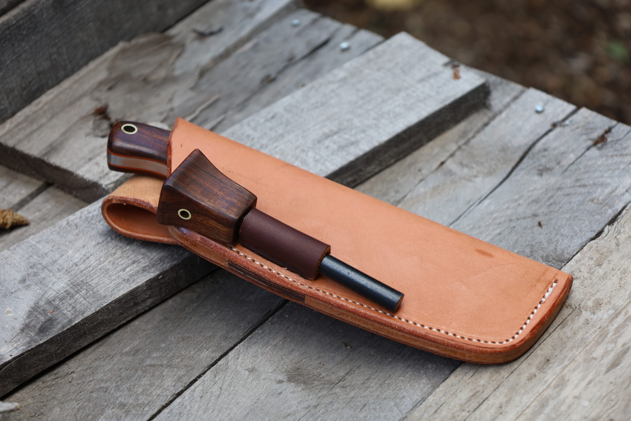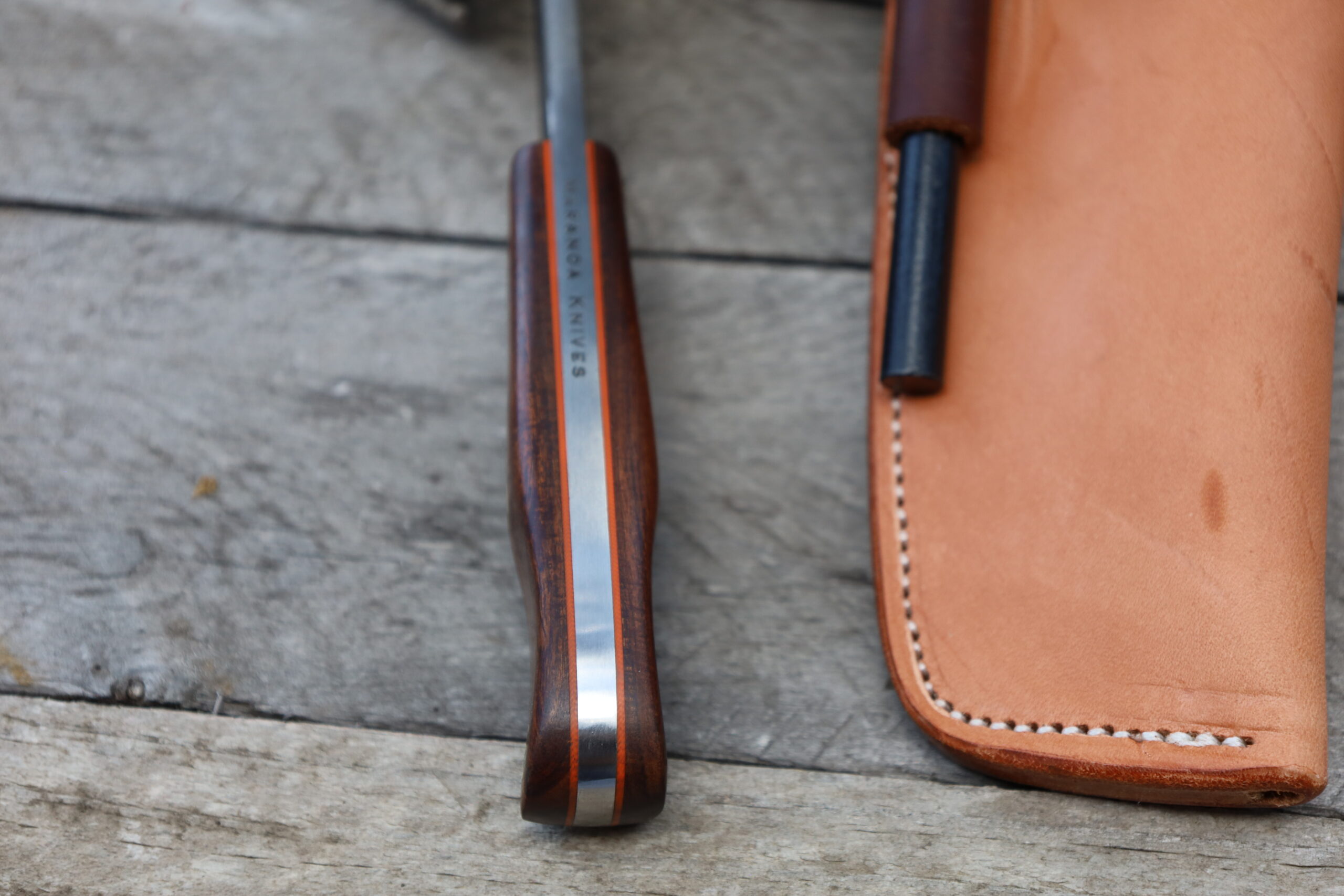 The overall length of the knife is 9″. The blade has a sabre grind. The scales are Gidgee with Orange G10 Liners with brass pins. The sheath is made from Hermann Oak Leather and has a firesteel loop.