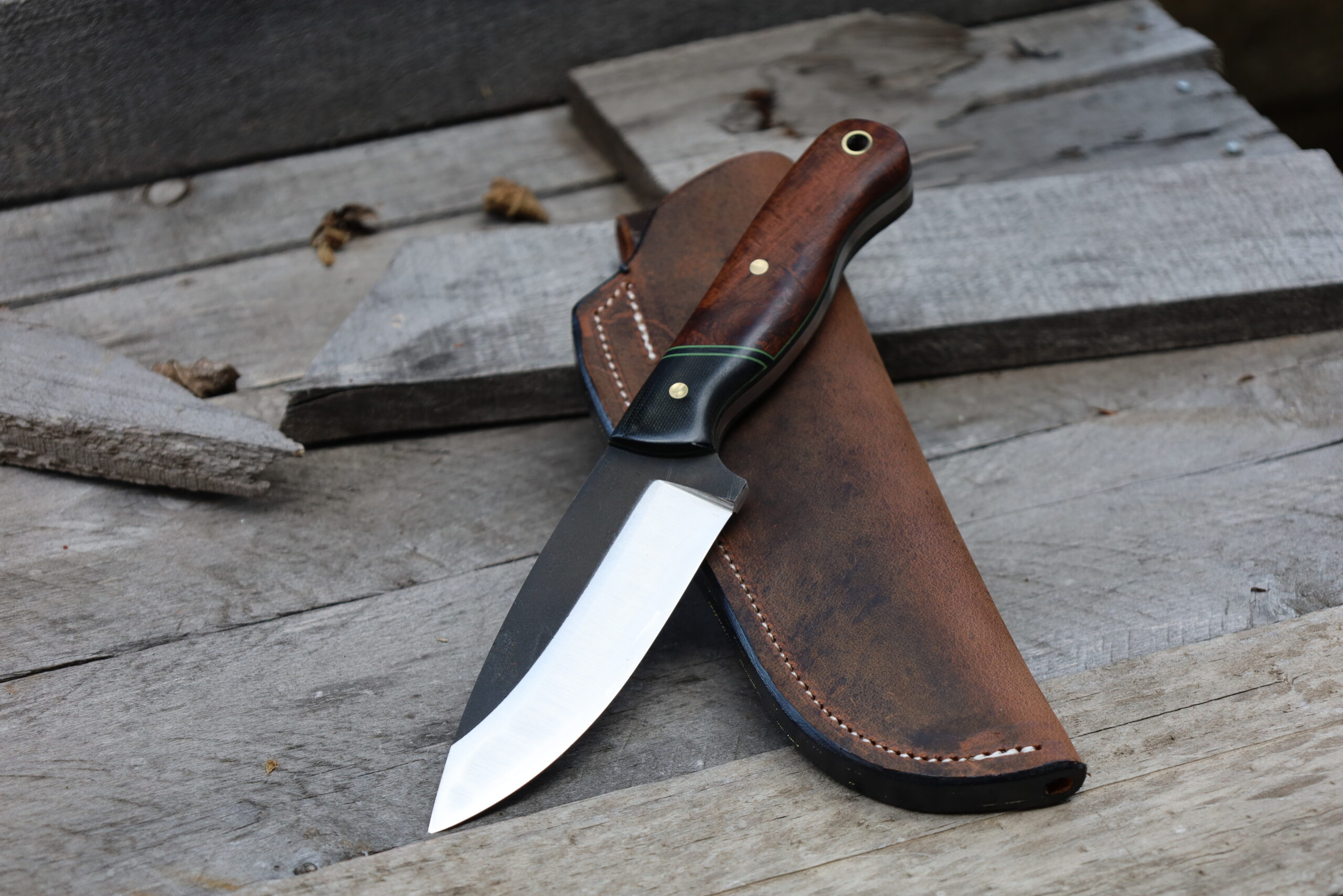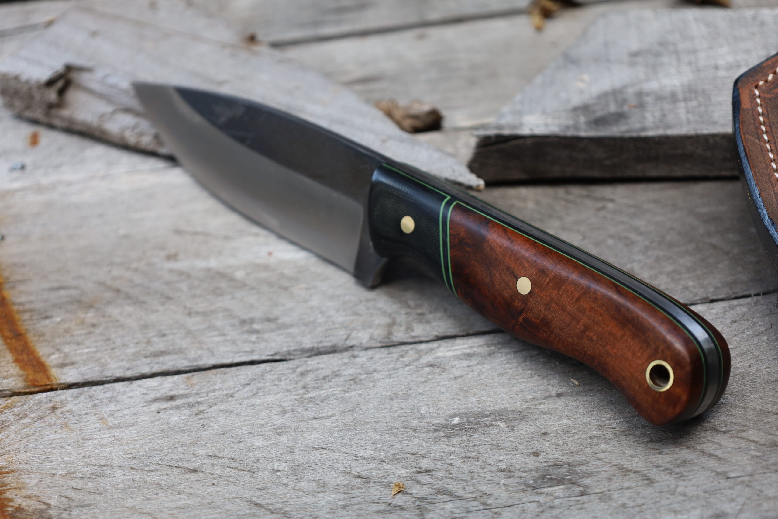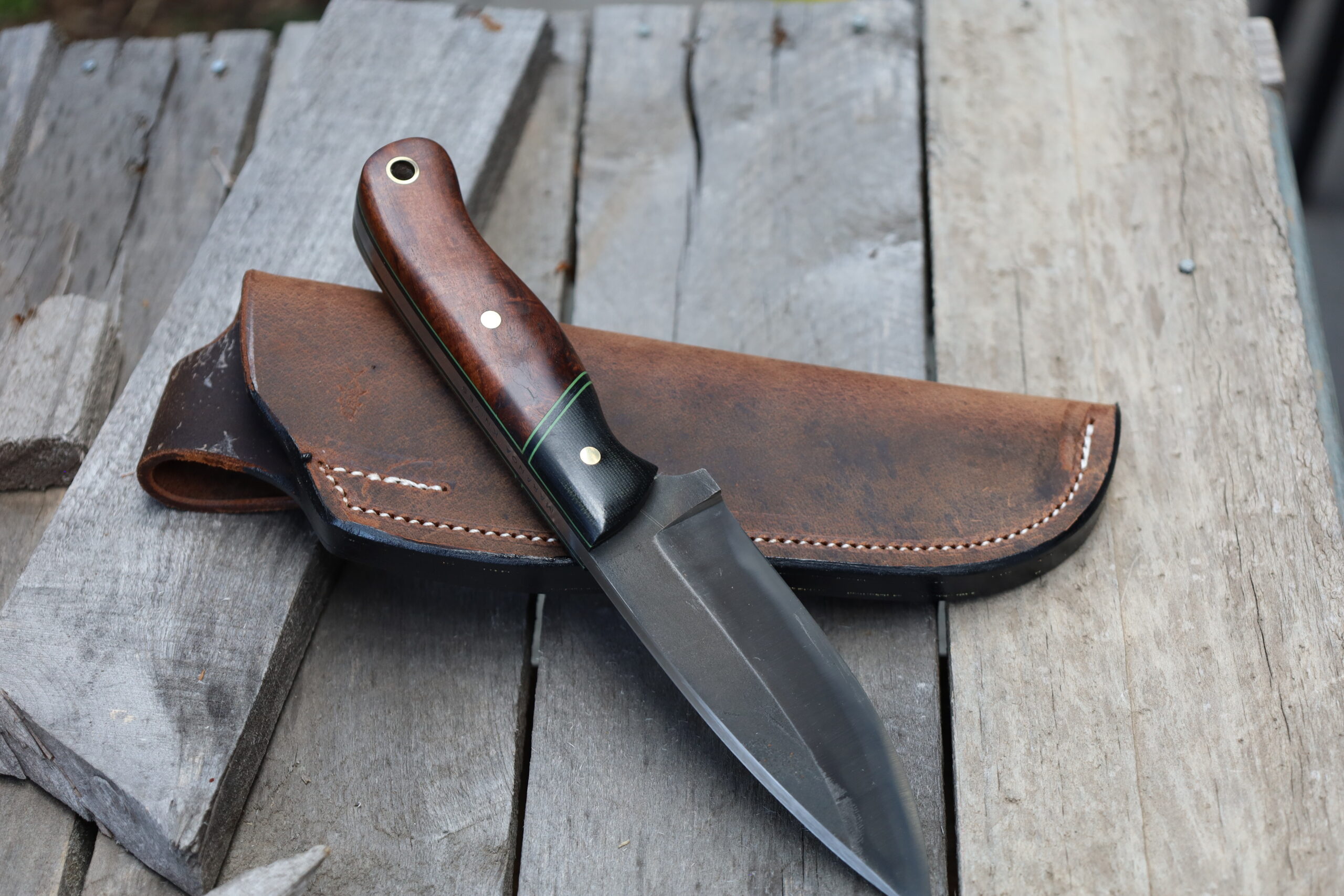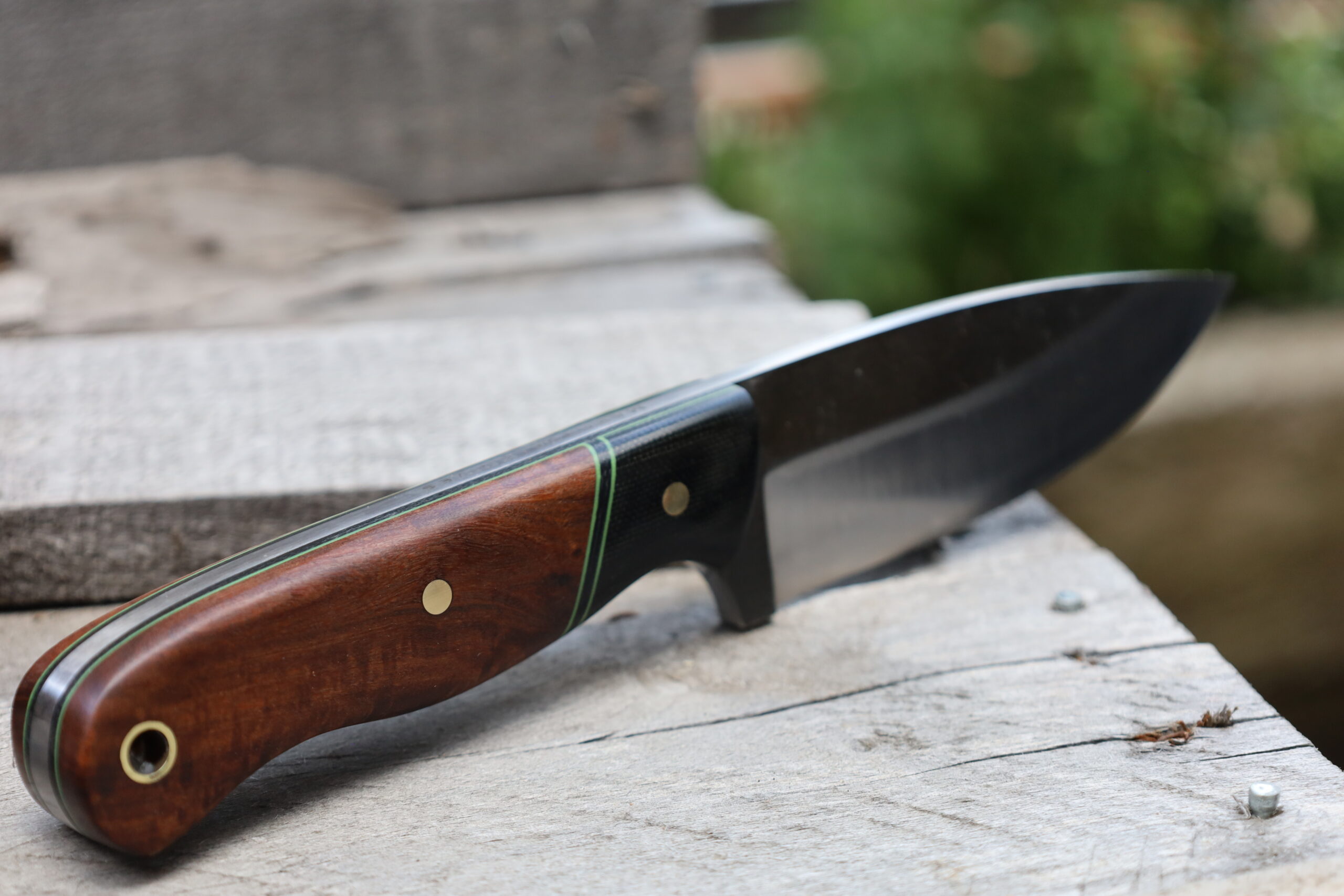 This knife was inspired by a couple of knives and is probably about the perfect size for an all round bushcraft knife. First inspiration came from the Architect Field Buddy 5.5 which was developed by the KnifeConnection in USA. It was also inspired by the Bark River Mini Aurora. I like the Field Buddy a lot but there are some things that I wanted to improve upon. The Field Buddy has a near full height grind and is traditionally manufactured from 1095 Carbon Steel. Whilst 1095 is a good steel, it lacks toughness, corrosion resistance and edge retention. The handle scales on the Field Buddy are removable and are a bit on the thin side. The Bark River Mini Aurora is a great shaped knife but the handle is too small. My version…the Medium Bushcraft is a stout general purpose bushcrafting knife that also doubles as a handy hunting and camp knife. It has enough belly to skin. As it is made of premium CPM Magnacut steel, the edge should last through many tasks without requiring a touchup.