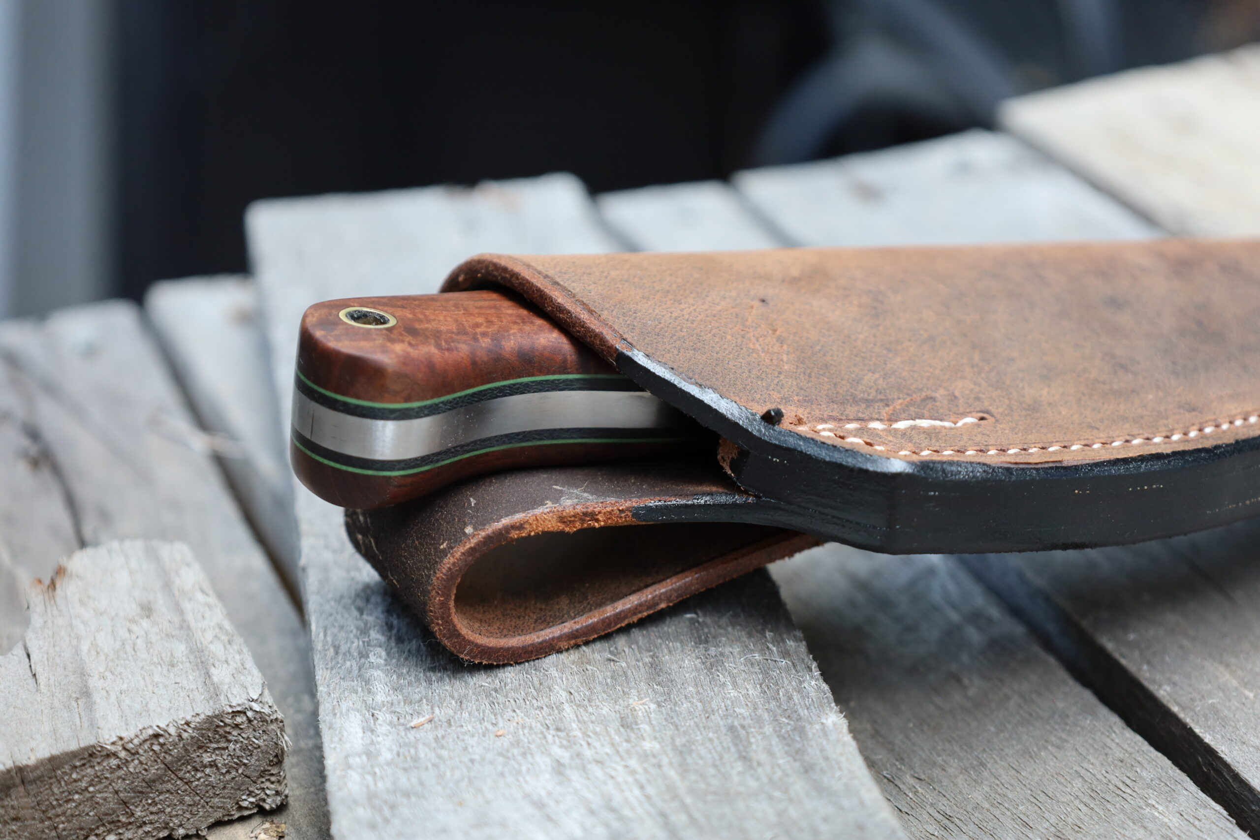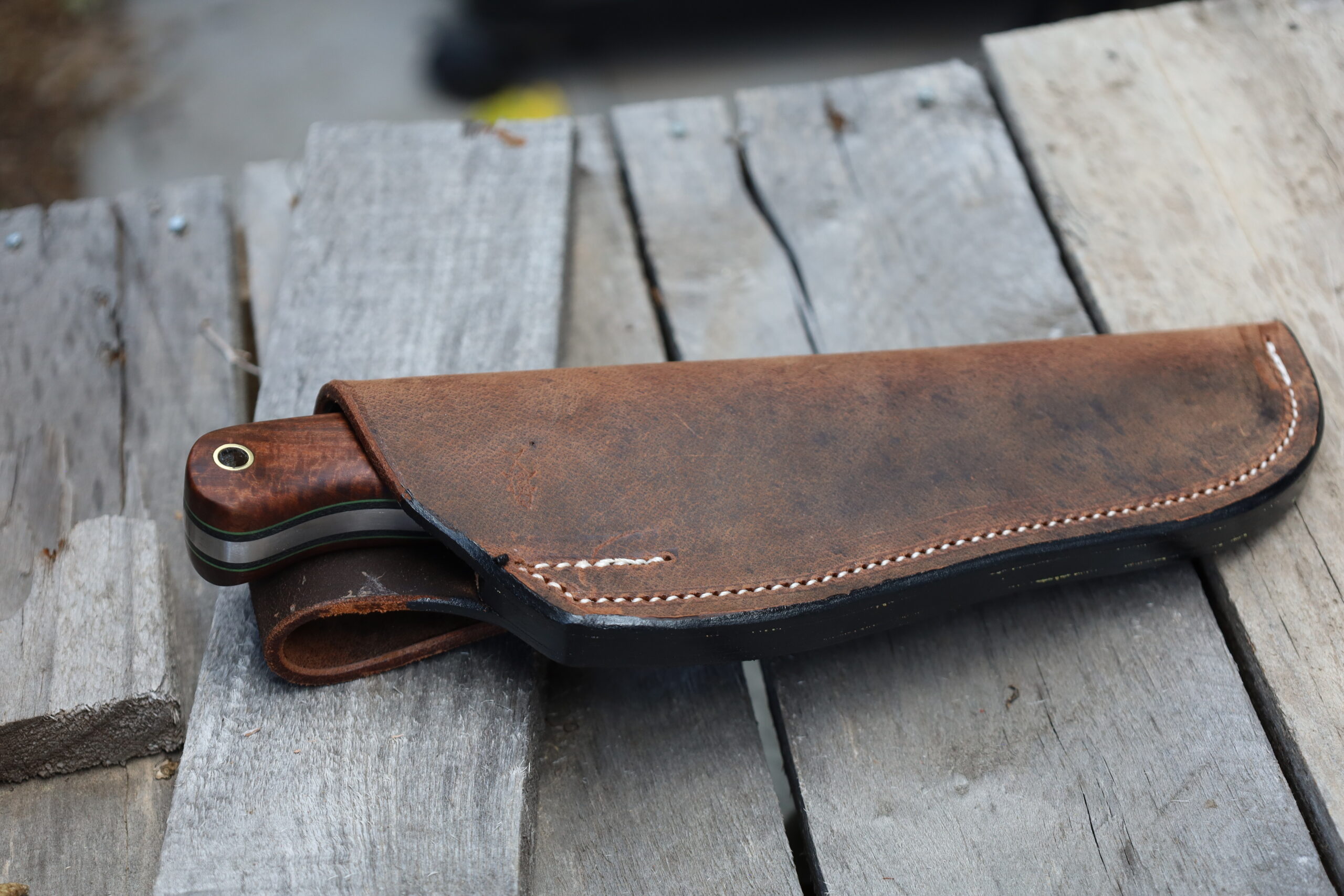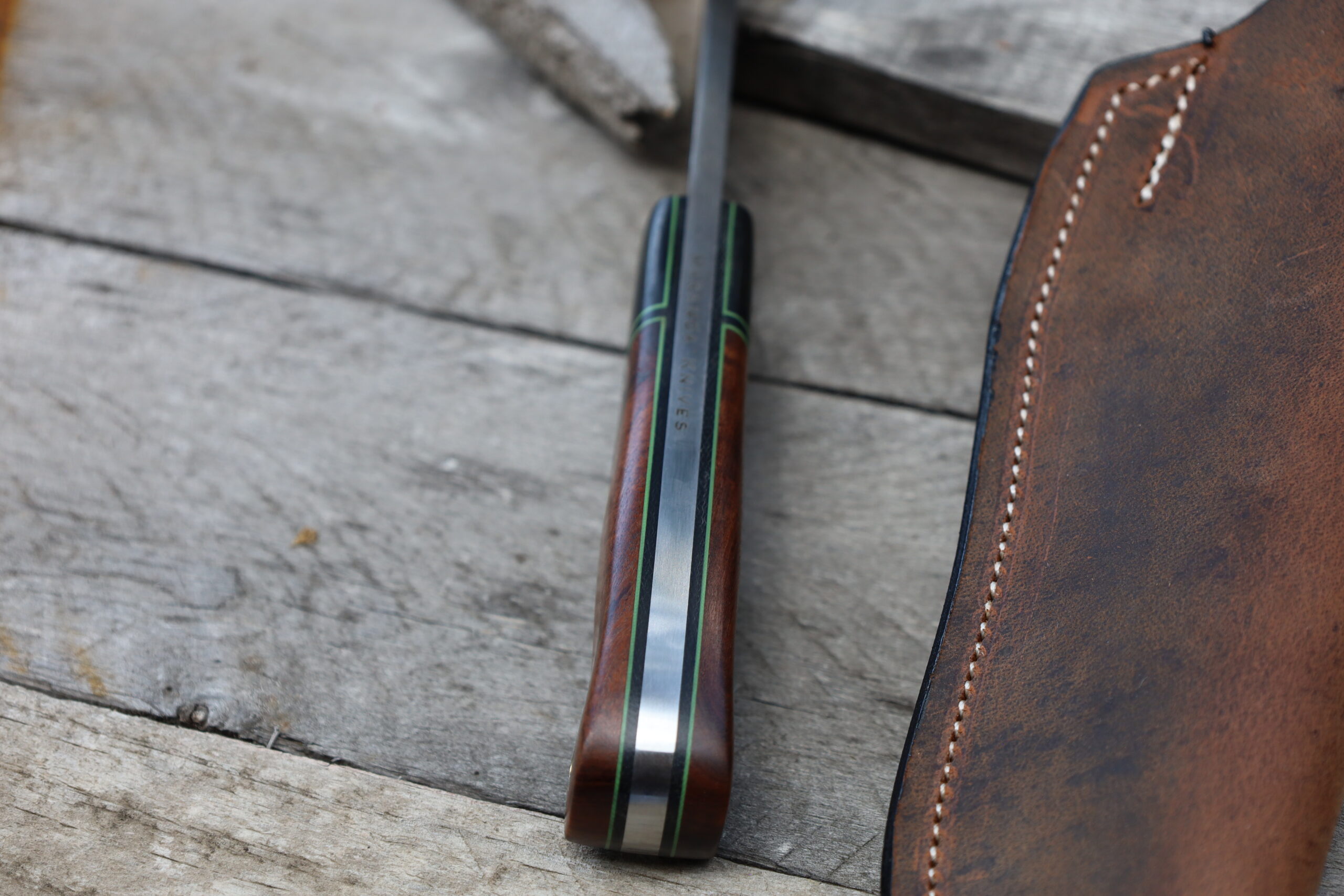 The overall length of the knife is 9″. The blade has a sabre grind. The scales are Black Micarta and Gidgee with Black Micarta Liners and Spacer with Green G10 pinstripes with brass pins. The sheath is made from Buffalo Hide Leather