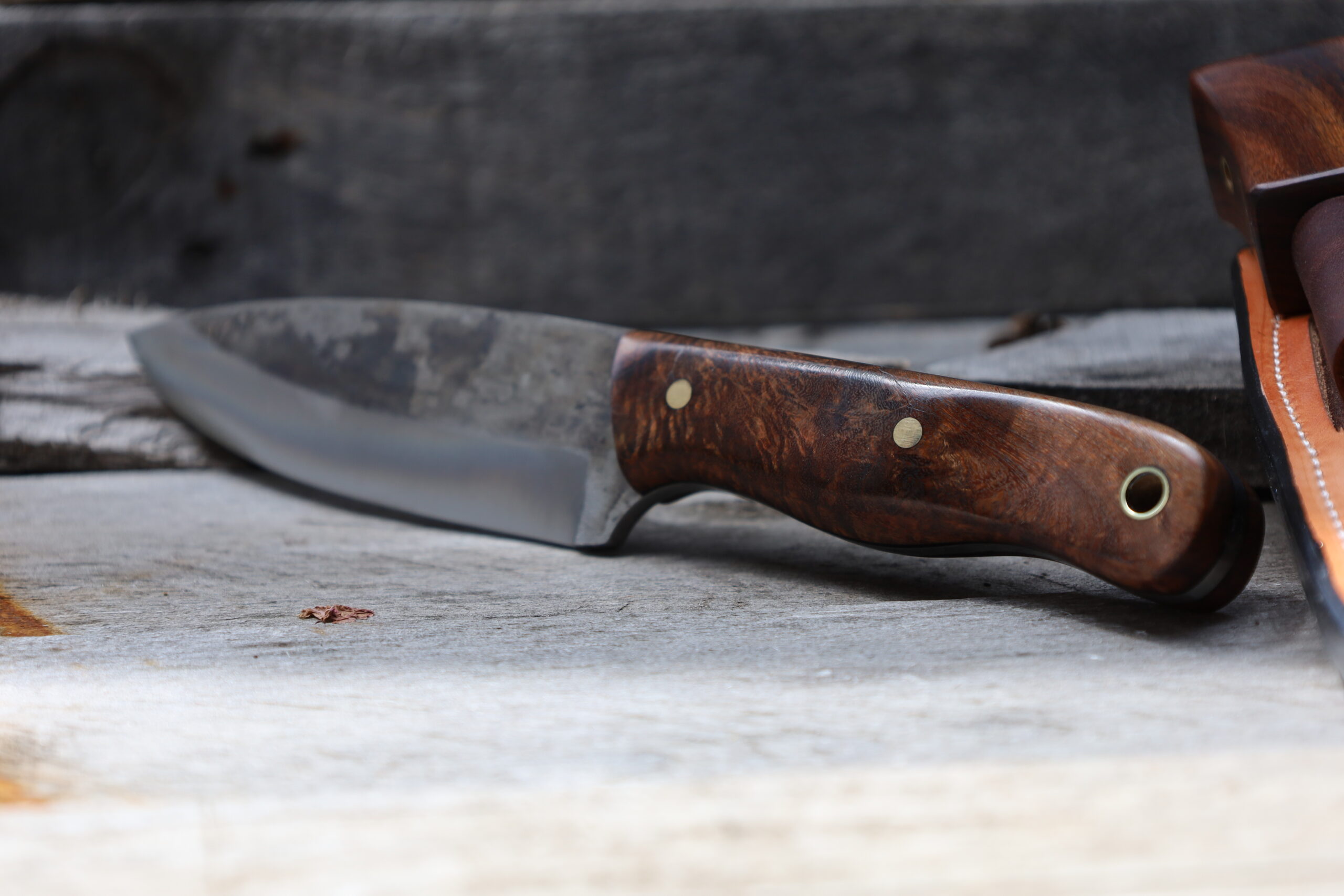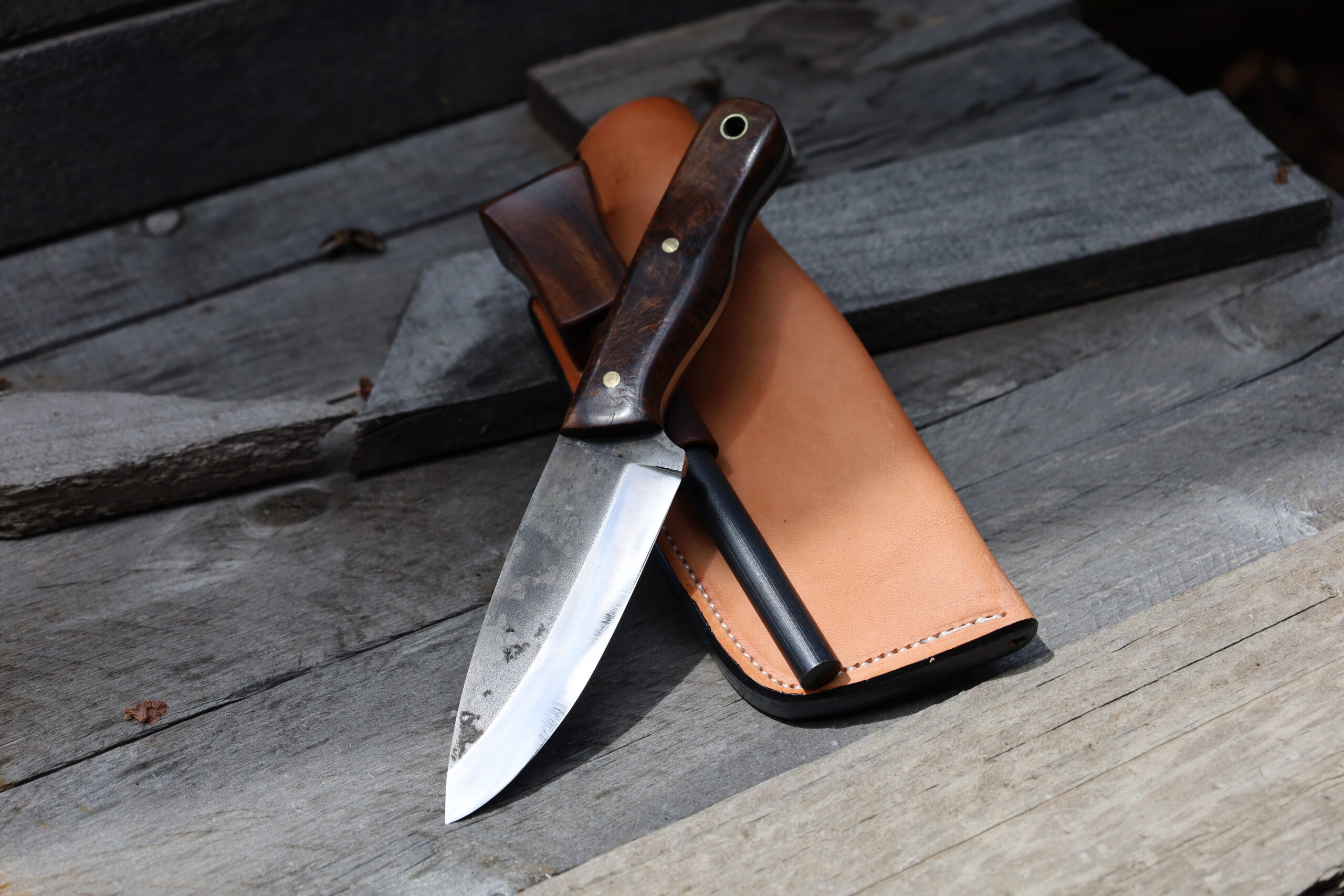 The overall length of the knife is 8.6″. The blade has a scandi grind. The scales are Gidgee with Black G10 Liners with brass pins. The sheath is made from Hermann Oak Leather and has a firesteel loop.