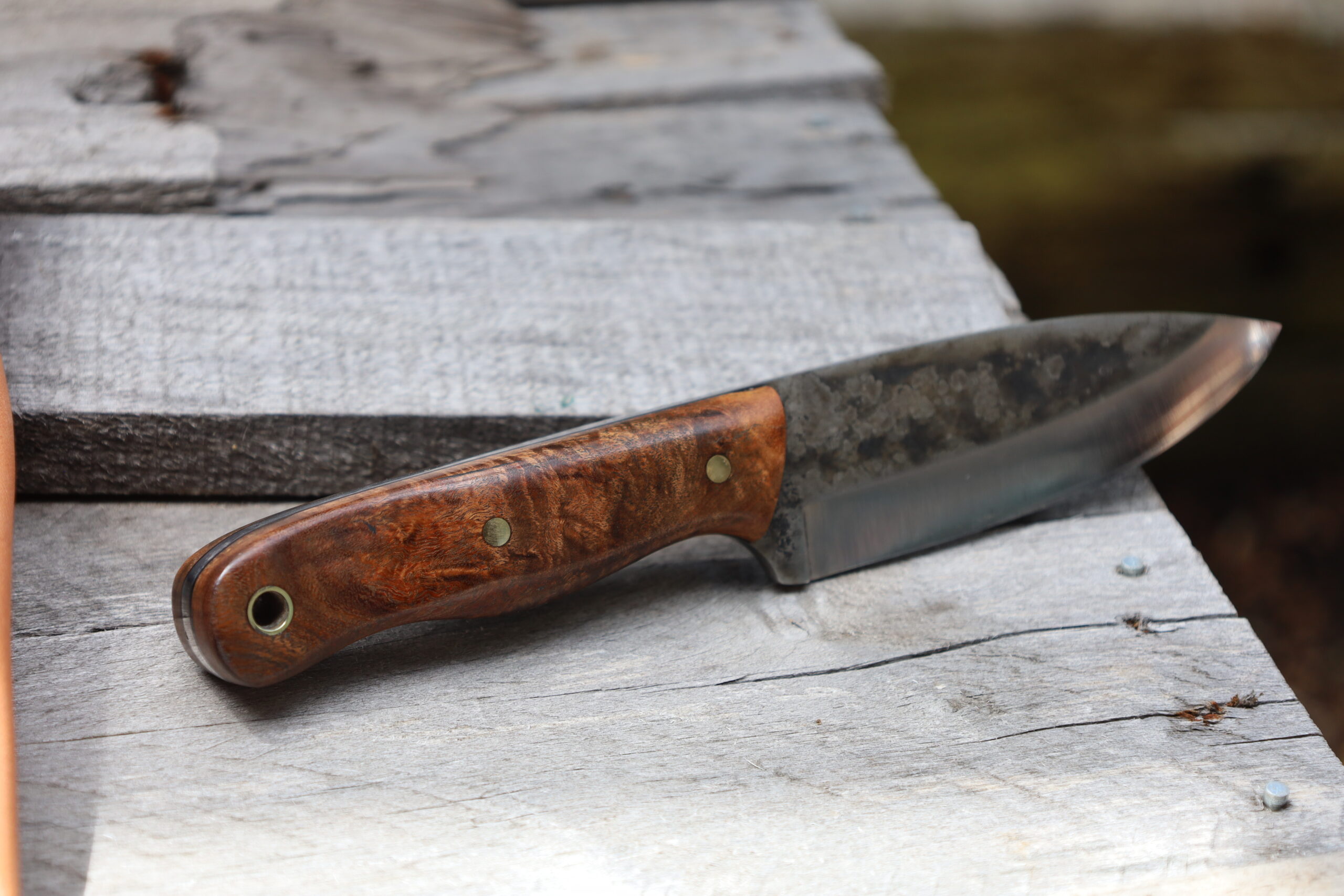 The blade is approximately 4.3mm thick and is 4.4 inches (115mm) long. It has been heat treated to 61.2 Rockwell by Ausmaker Supplies in Sydney. The spine has been ground to a sharp 90 degrees so it will strike a fero rod with ease to produce a shower of sparks. As this knife is made with O1 Tool Steel, it will corrode if you leave it out in the elements. Having said that, if you look after it, O1 is a great steel for Bushcraft knives.
