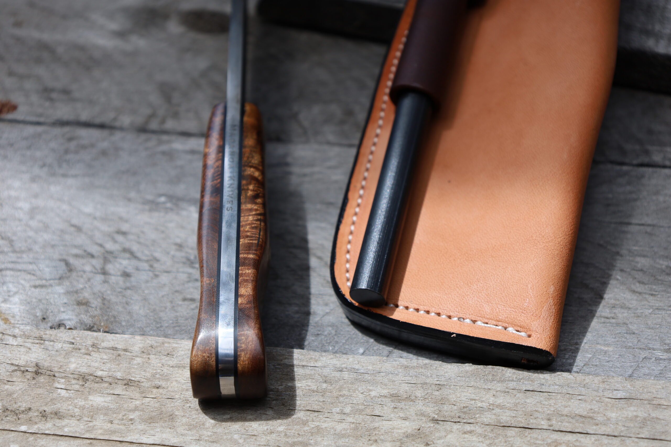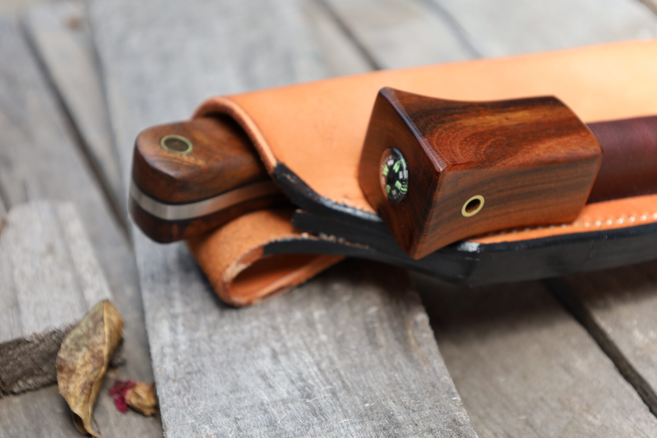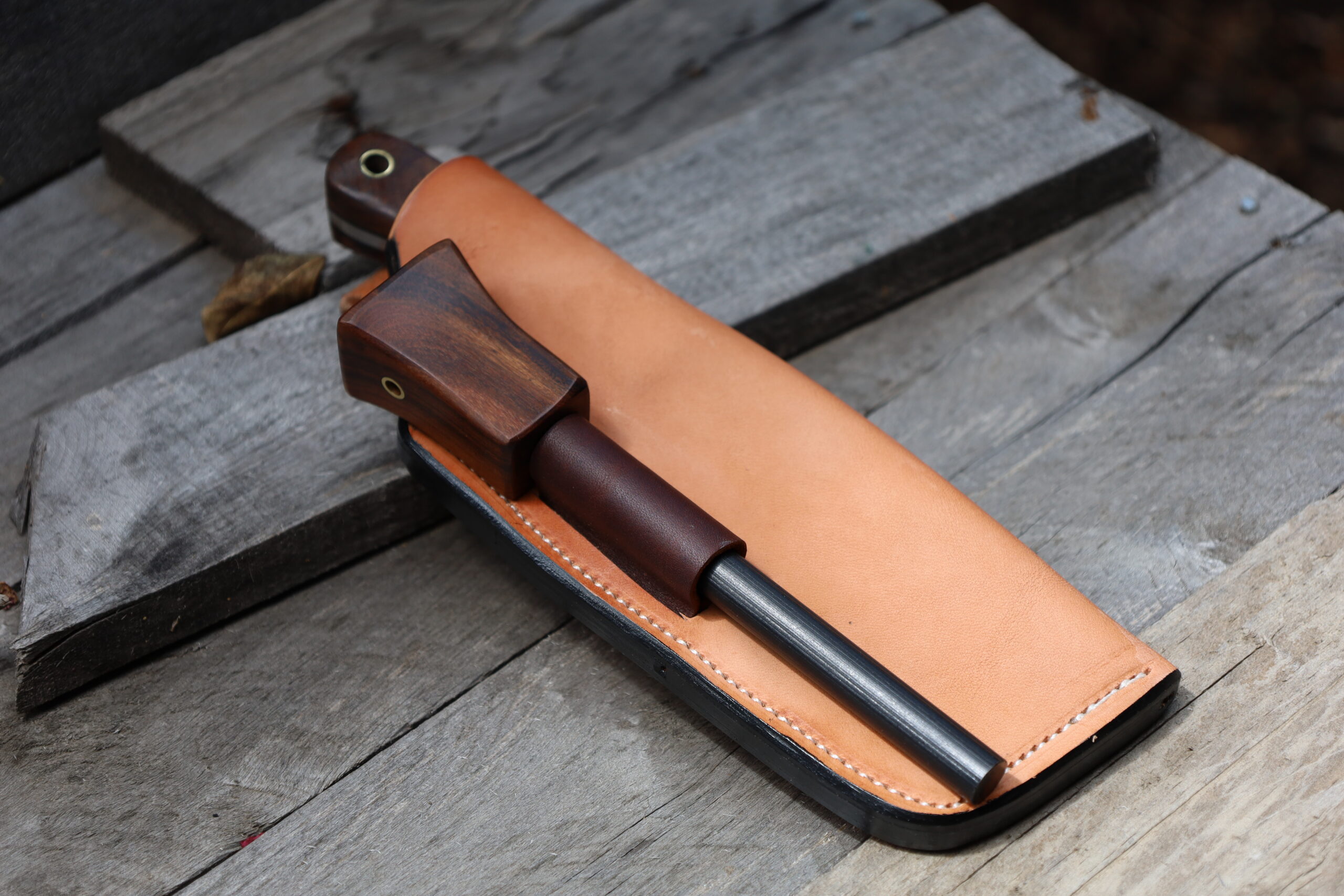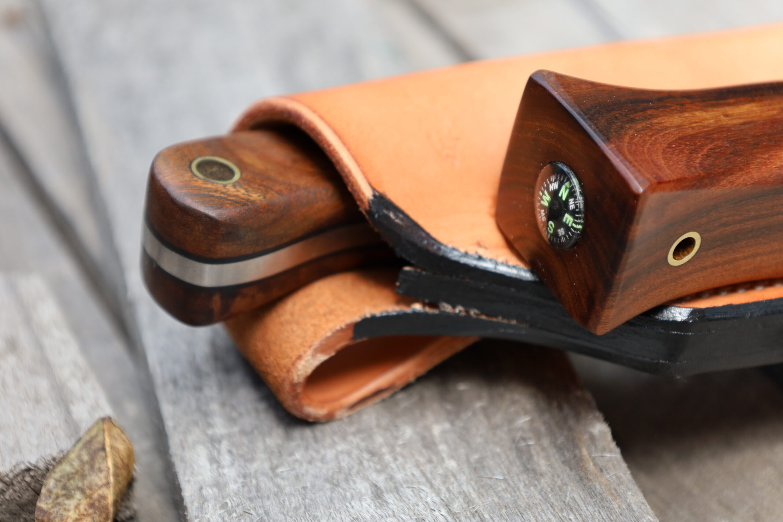 The firesteel is made using Gidgee from the same larger bit of timber that I cut the handles scales from. I cut the timber from a fallen tree near Charleville in South West Queensland. The firesteel is 12.5mm in diameter and 7 inches long (overall). I’ve also installed a quality “Made in Taiwan” Helikon-Tex compass in the rear.
