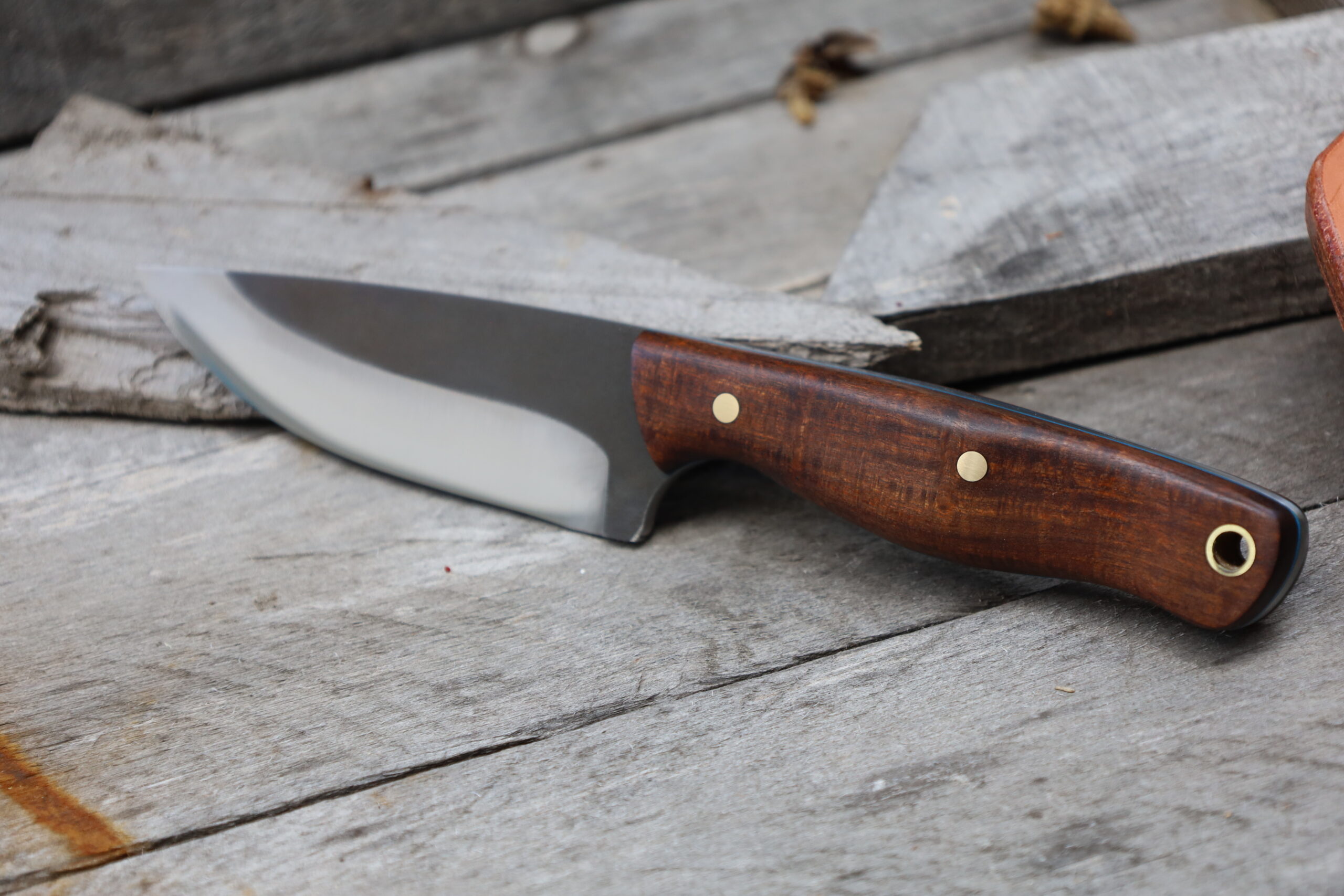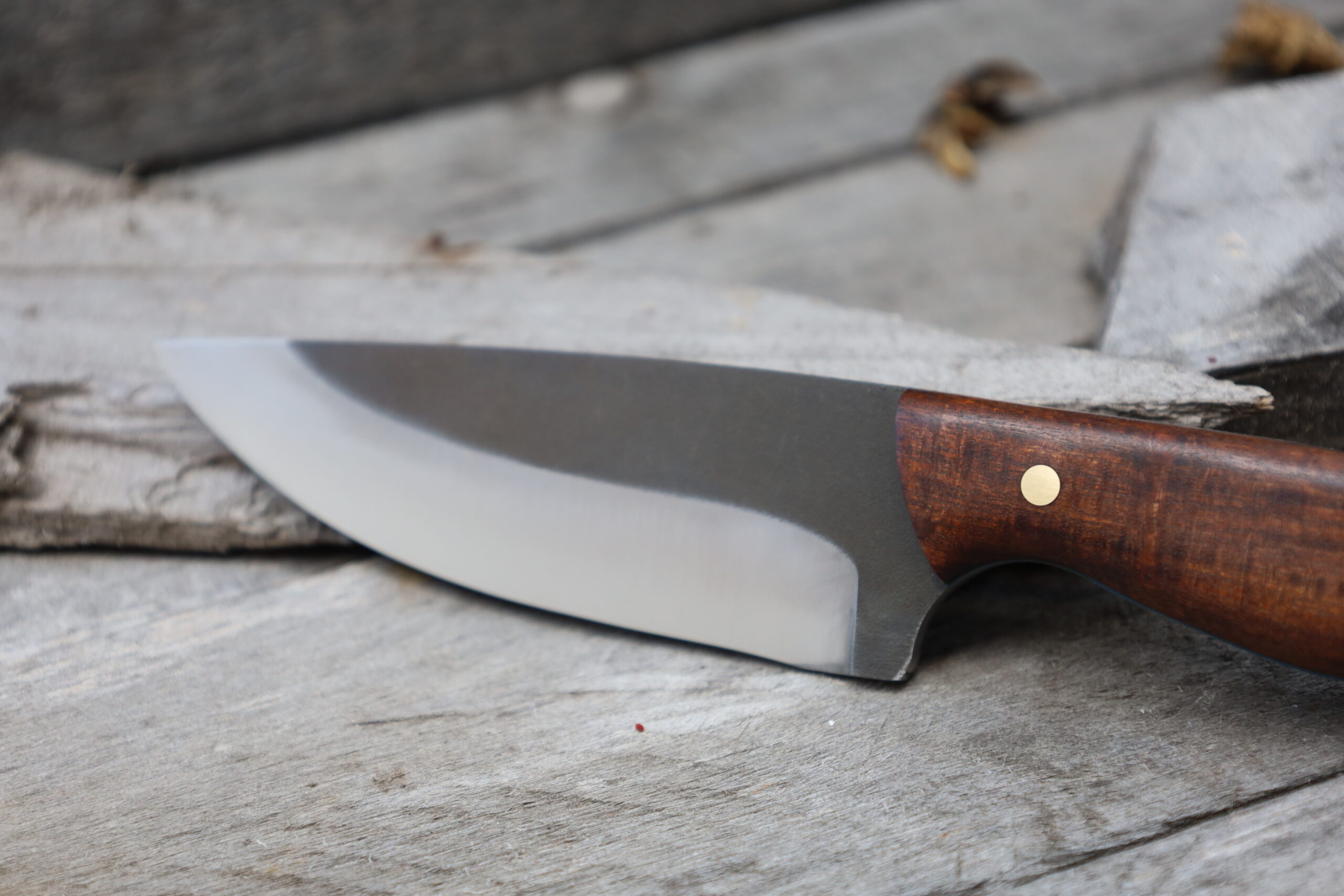 The knife is my own design and is inspired by 3 American Knives. The Bark River – Fox River and their Fox River Ext 2. Both of these knives have a great feel to them as hunting knives and can be utilised for bushcraft purposes. The 3rd knife is the White River Hunter which is also a very nice knife. My Semi Skinner Hunting Knife is probably a cross between those 3 and very similar to my Utility Hunter but I’ve shortened it to around 3.8 inches. It still has a full handle size. The blade profile has a nice continuous sweep so would make a great skinning knife. You could also use it as a food prep knife in the camp. I made this Semi Skinner using Nitro V so you shouldn’t have any issues with rust. It has been heat treated to 62 Rockwell by Tim at Ausmaker Supplies in Sydney.